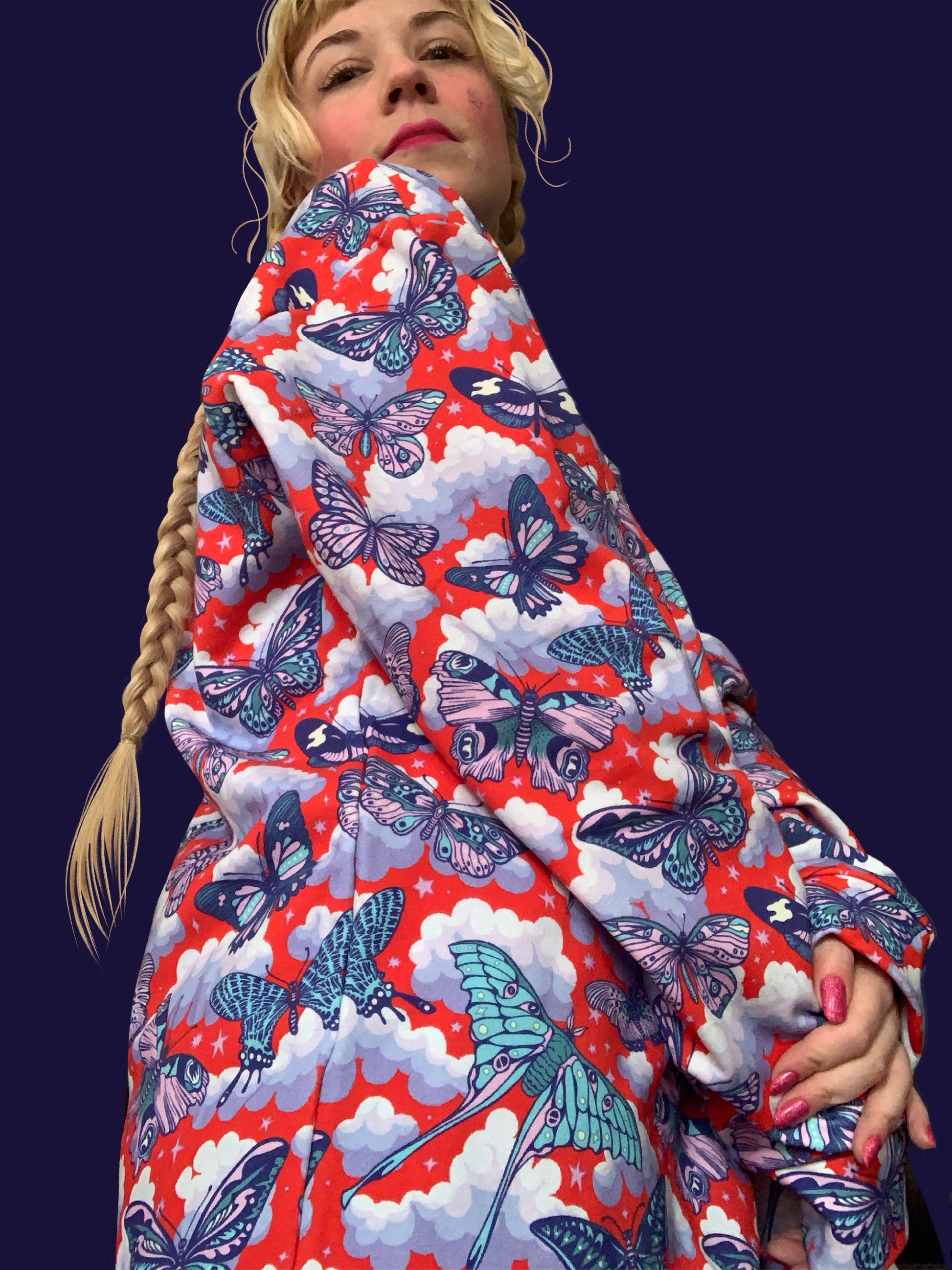 Butterfly in the sky!  This cotton pullover features a red cloudy sky with lots of butterflies I drew for you.  Great layering piece for the cold weather! So anyways I’m wearing an XL in the picture BTW.  If you like a roomy fit, don’t be afraid to order a size or two up, ok?  This will arrive 2-3 weeks after you order it OK?